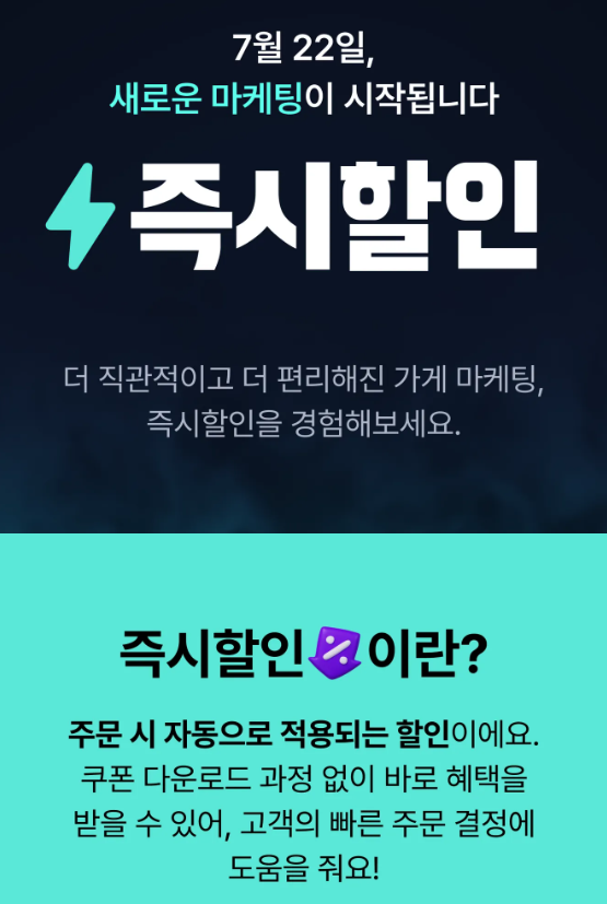 쿠폰을 사용하는 손님도 있고, 안쓰는 손님도 있는 현재의 반해, 즉시할인은 쿠팡 와우할인과 같은 개념으로 결제할 때, 무조건 할인을 해주는 구조로 변경되는 것이기 때문입니다. 해서 이 부분을 신경을 써가면서 매장 업무를 조절하셔야 할 것 같습니다.